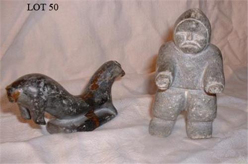 OTTER MISSING TAIL, REPAIRED BREAKAGE - 5" W, HUNTER MISSING PIECES FITTED INTO HANDS - 4" H, WEIGHING 0.6 LB. COMBINED.