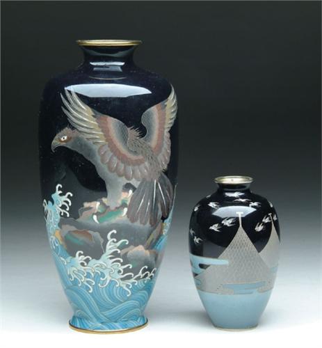 TWO JAPANESE CLOISONNE ENAMEL VASES. 1) 5 in. tapered vase decorated with pyramid type structures, many flying birds on a black and light blue ground. 2) 9-1/2 in. tapered vase with large eagle resting on a rock with waves against a black ground. CONDITION: Very good to excellent. Estate of Jon Heiden and Donald Mooers 5-60771, 5-60712
