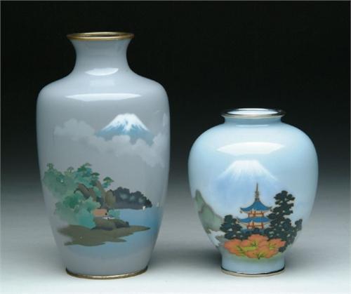 TWO JAPANESE CLOISONNE ENAMEL VASES. Both scenic with Mt. Fuji and buildings with trees on blue-gray ground. SIZE: 7-1/2 in. t and 5 in. t. CONDITION: Very good to excellent. Estate of Jon Heiden and Donald Mooers 5-60785, 5-60786