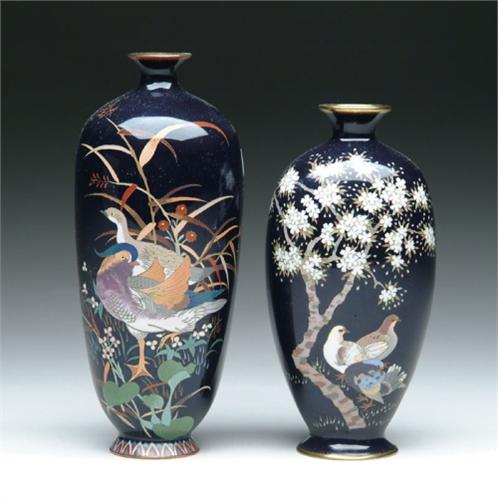 TWO JAPANESE CLOISONNE ENAMEL VASES. 1) 6-1/4 in. footed, tapered vase with white flowering tree and three doves on a deep blue background. 2) 7 in. tapered vase with two colorful ducks amongst a flower and reed background, all on a deep blue ground. Signed on the underside with an "E" inside a circle. CONDITION: Very good to excellent. Estate of Jon Heiden and Donald Mooers 5-60760, 5-60780