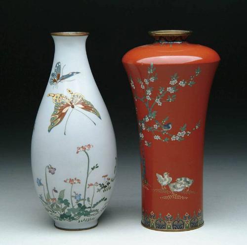 TWO JAPANESE CLOISONNE ENAMEL VASES. 1) Flaring shoulder style vase has flowering tree with bird and chicks on a red ground. Marked on the copper base. SIZE: 9-3/4” t x 5” at widest. CONDITION: Very good to excellent. 2) Vase decorated with butterflies and flowers on a light gray ground. SIZE: 9-3/4” t. CONDITION: Chip and cracks to enamel under lip of vase. 5-60713, 5-60715