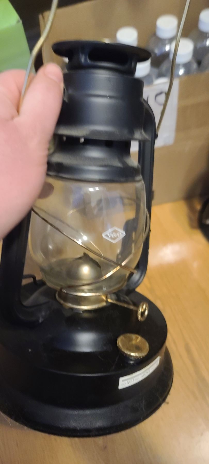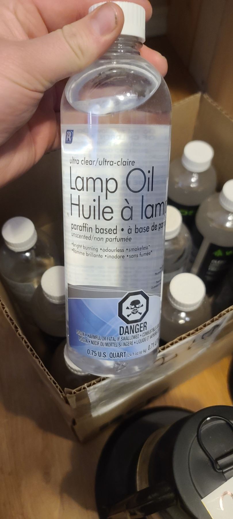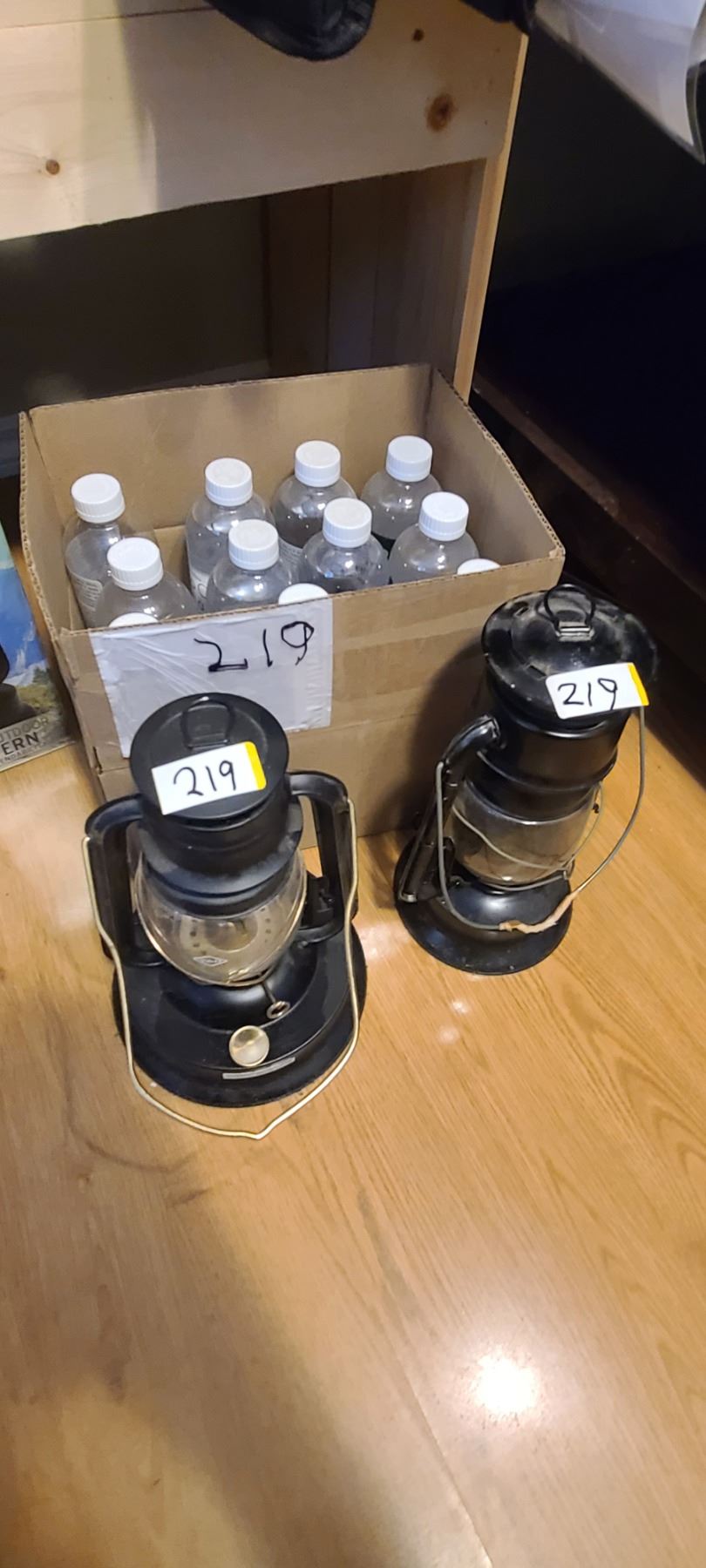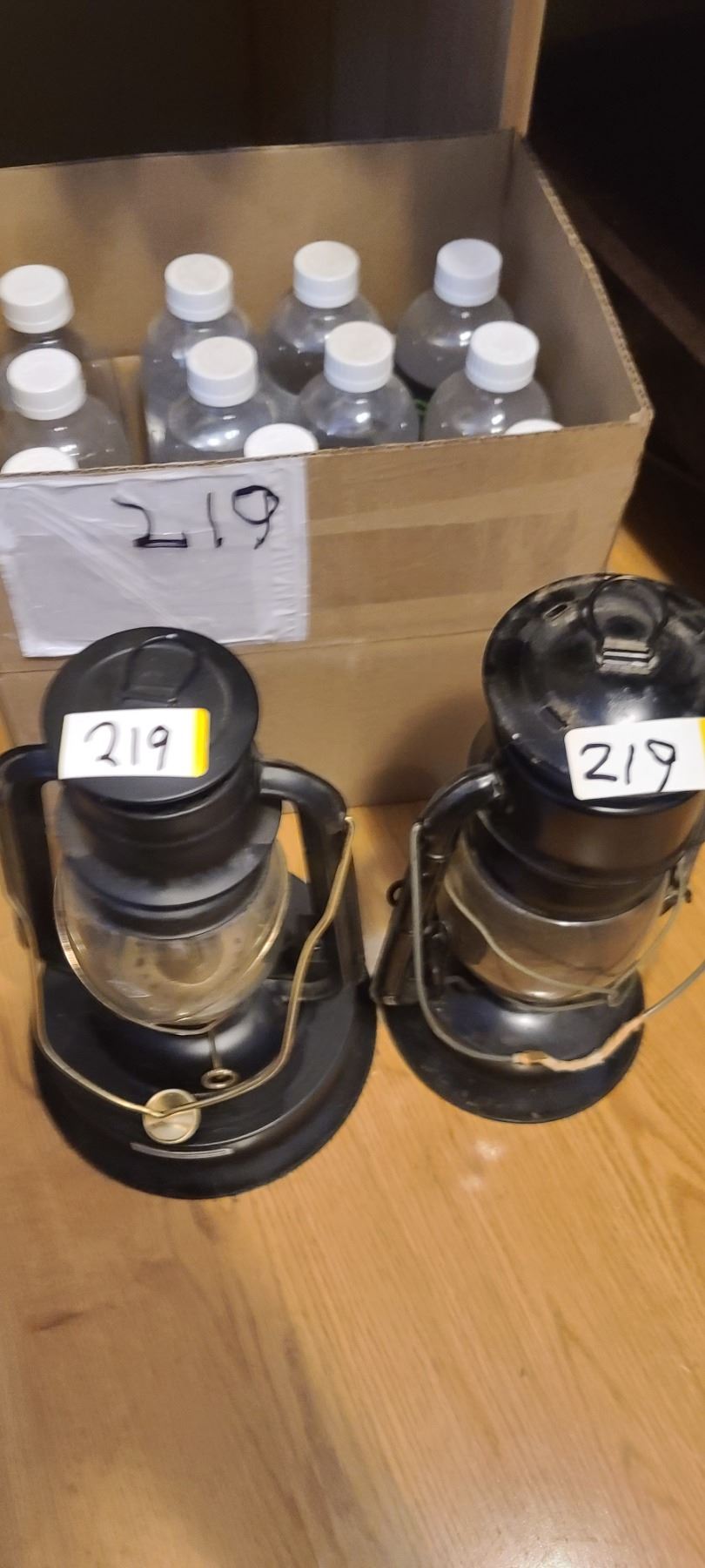 TWO KEROSINE OIL LAMPS AND BOX OF LAMP OIL