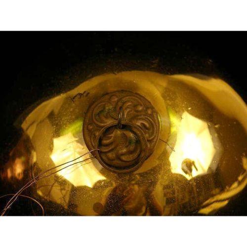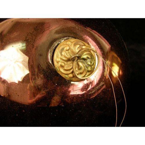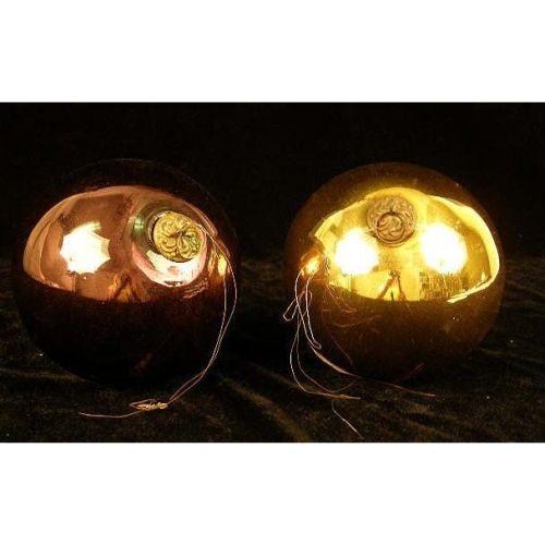 TWO KUGEL CHRISTMAS ORNAMENTS<BR><BR>One amethyst and one gold, with embossed brass caps, some discolorations, 4 1/2"dia.