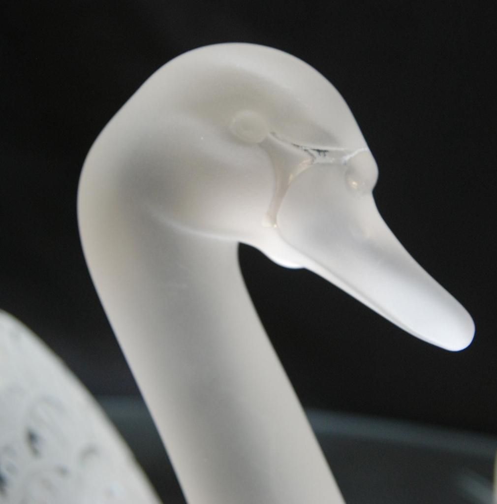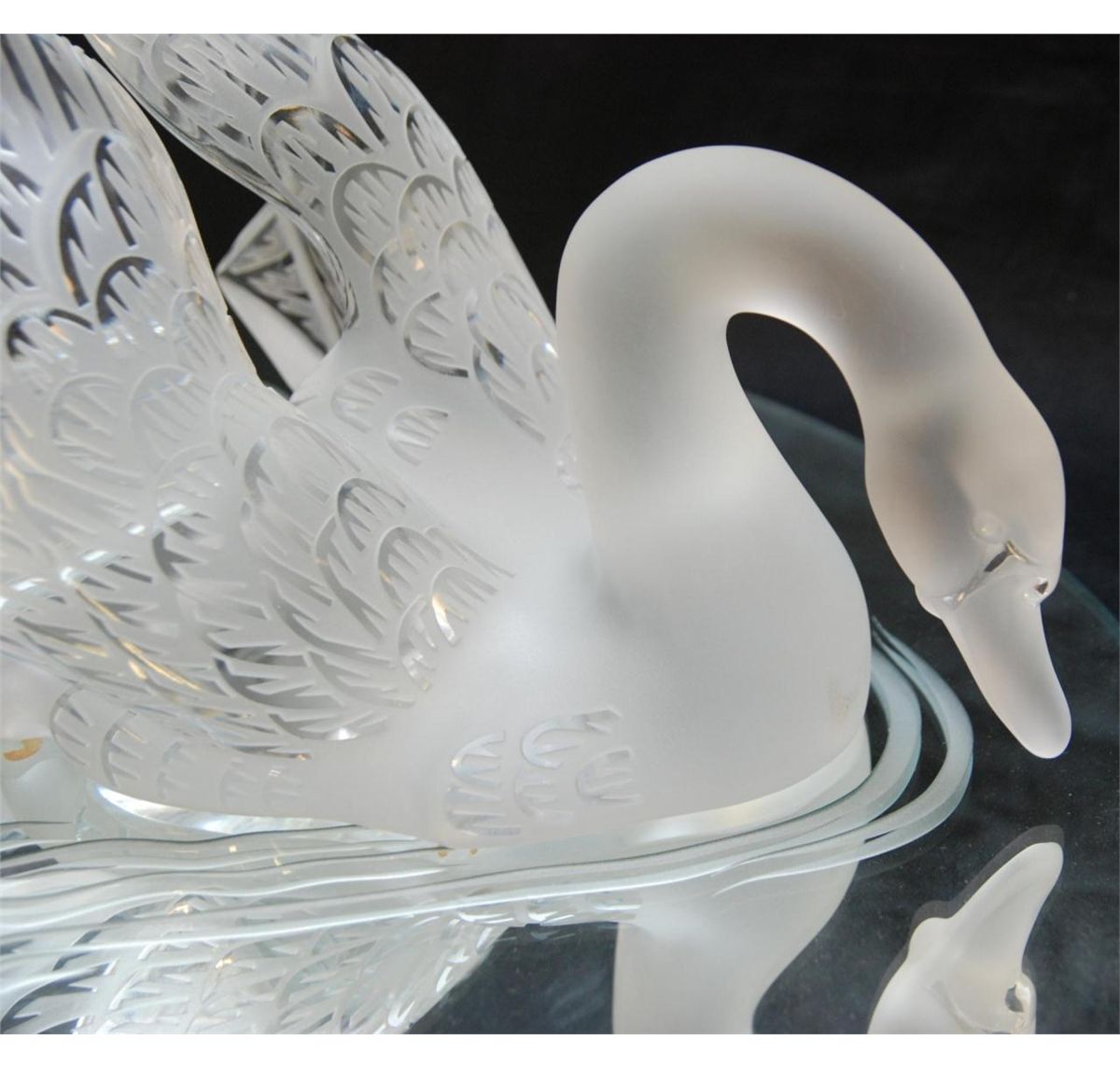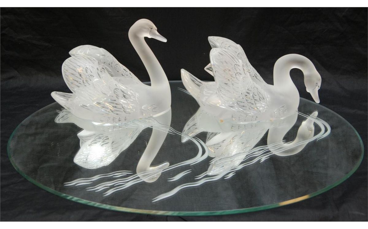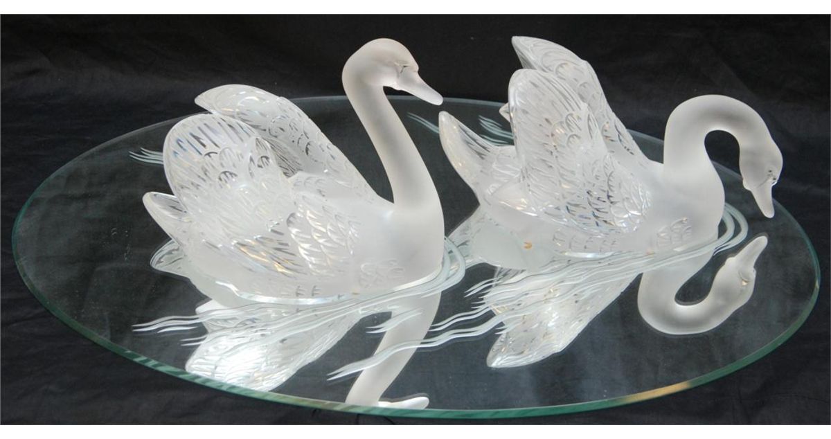 Lalique France crystal swans. Includes one swan with head up, one swan with head down and oval mirror base. Measurements: head up swan 10" length (25.4cm). Head down: 14" length (35.5cm).