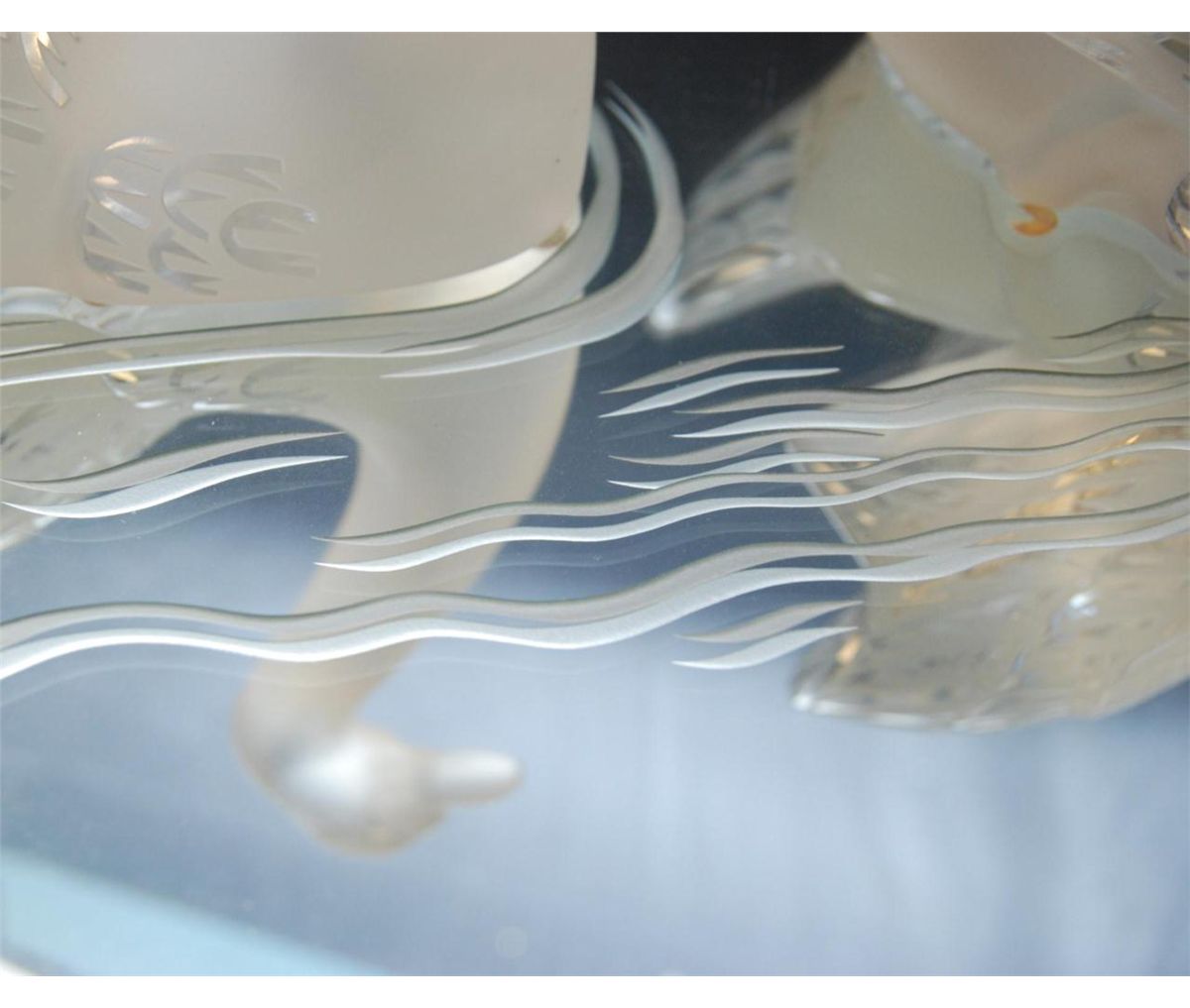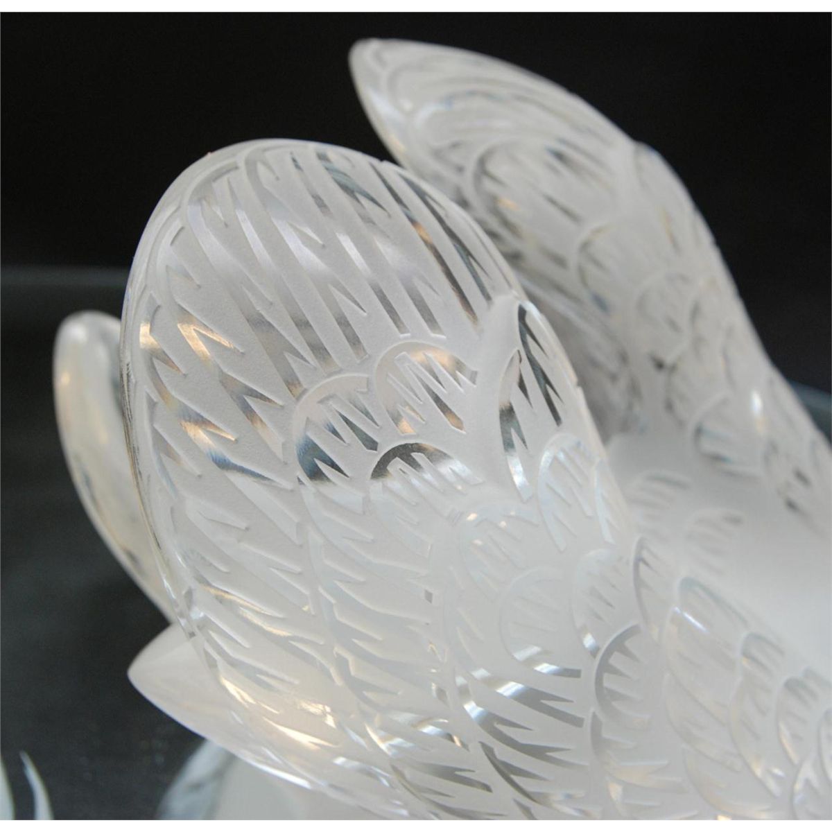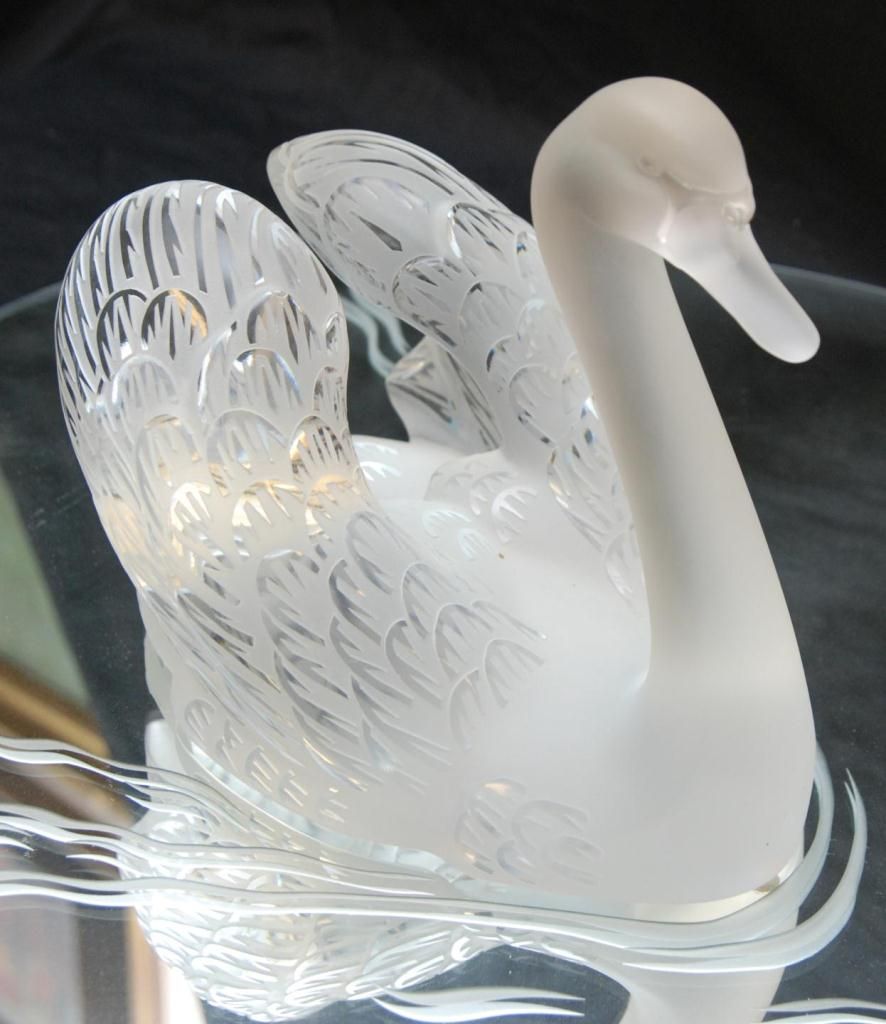 Lalique France crystal swans. Includes one swan with head up, one swan with head down and oval mirror base. Measurements: head up swan 10" length (25.4cm). Head down: 14" length (35.5cm).