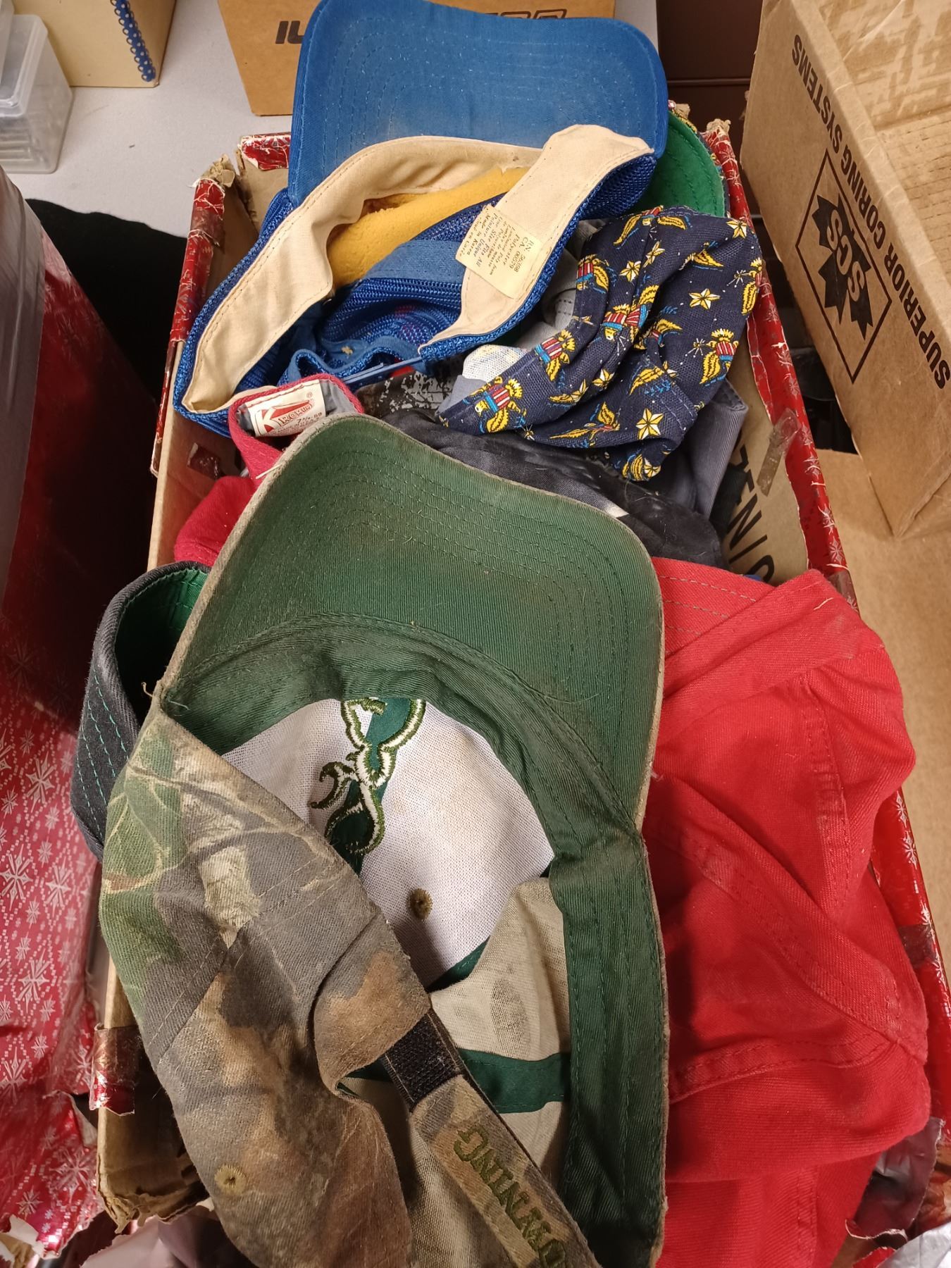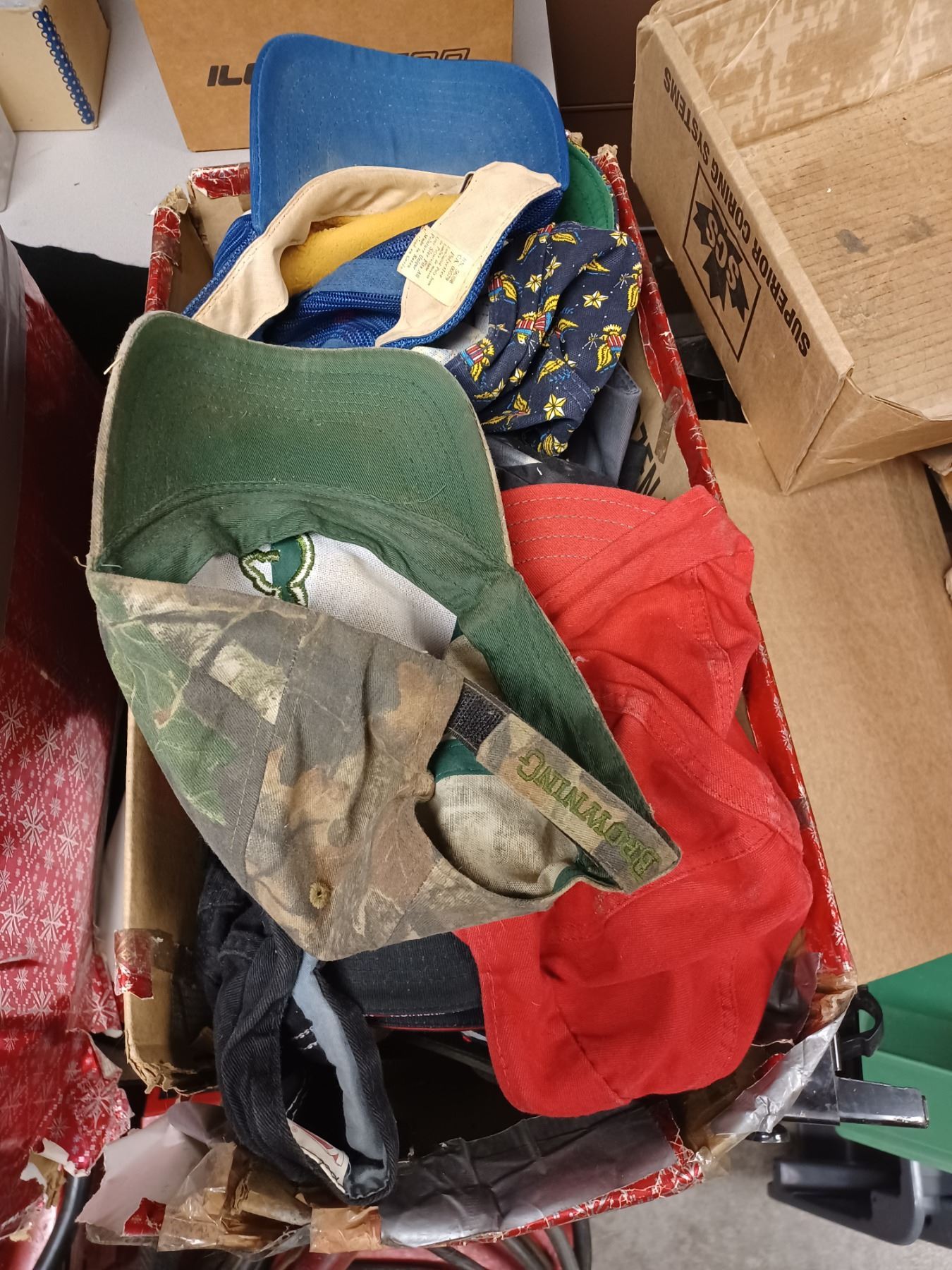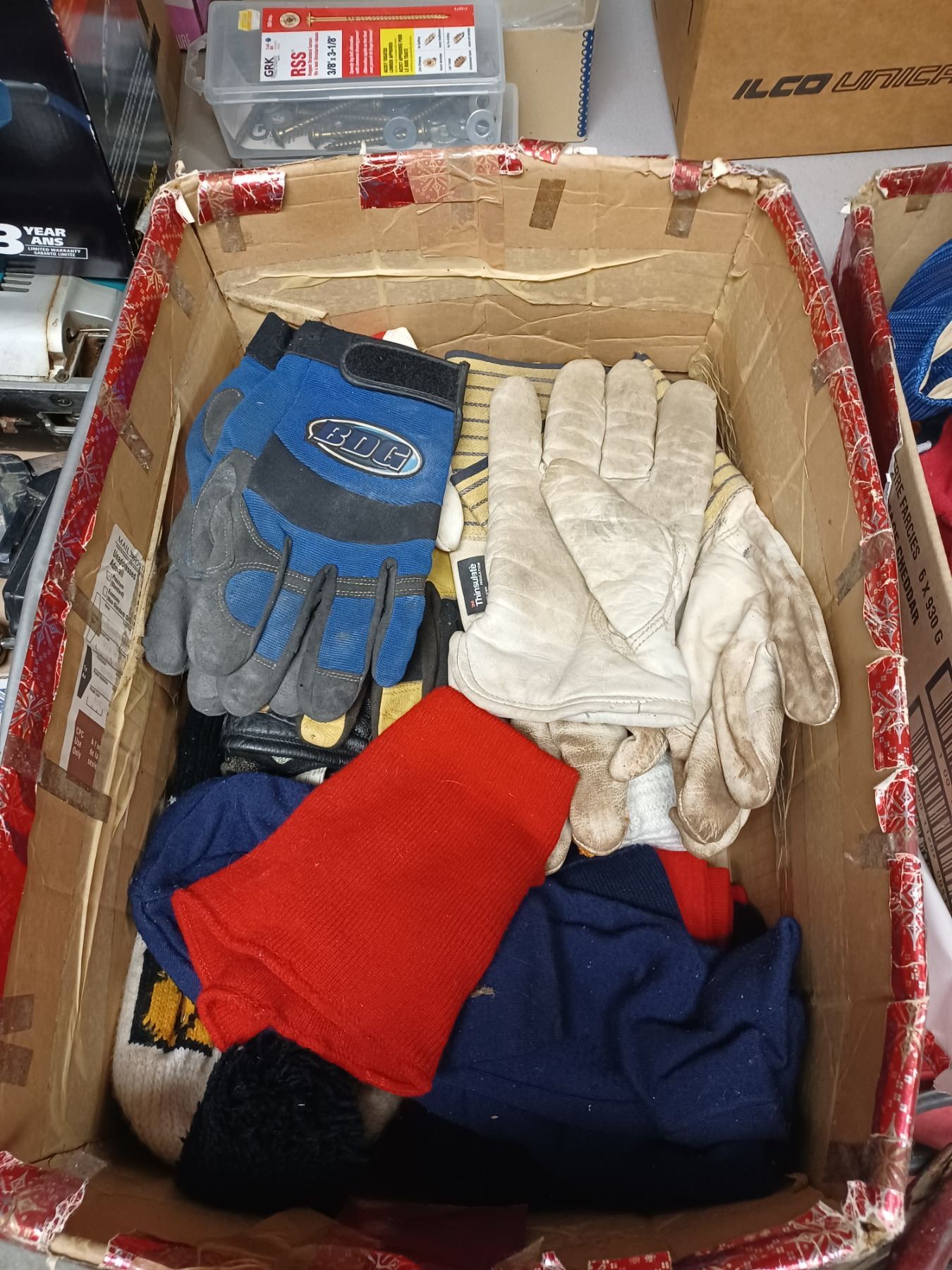 TWO LARGE BOXES HATS, TOQUES, WORK GLOVES AND NECK GATORS