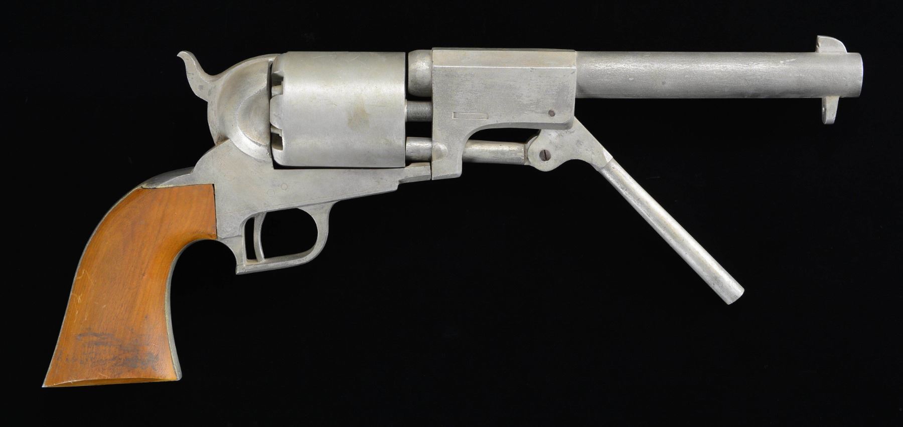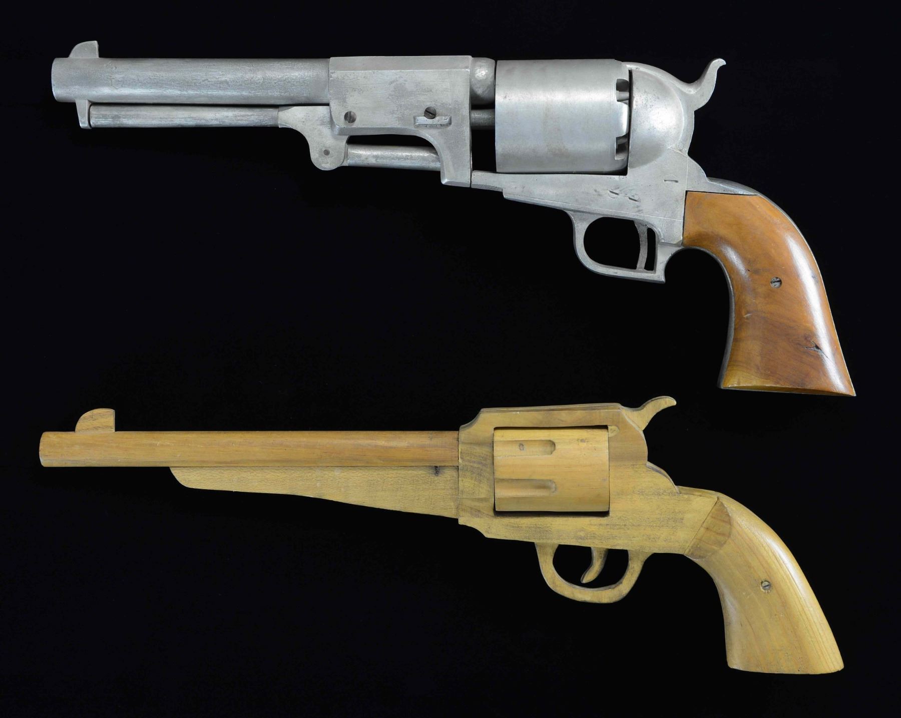 REMINGTON ARMY. Both models are 28" long, the Colt is crafted from aluminum with functional loading assembly and cylinder that will turn, wood grips. The Remington model 1875 is carved totally from wood. CONDITION: very good overall, impressive display models. PROVENANCE: Martin Lane Historic & Western Americana Lifetime Collection. (02-21699/JS). $600-800.