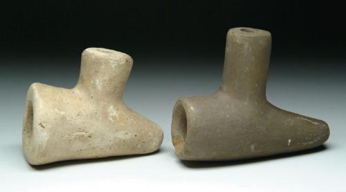 TWO LATE WOODLAND TO PROTO-HISTORIC TYPE MODIFIED ELBOW PIPES. Sandstone. Circa 1200-1600AD style. SIZES: 4in. l x 3-1/2in. and 4in. l x 3in.. CONDITION: Very good. 9-25984-19 The Tennessee Collection of Prehistoric Indian Artifacts from the Allen Graves Estate. SPECIAL NOTE: We do not regularly sell Prehistoric Indian stone artifacts and therefore have very little experience and no expertise in this area. All of the following lots have come from the Collection of the Late Allen Graves of Tennessee. The collection was inherited some years back by his daughter, who now lives in Maine. This collection was consigned to us directly from her. We employed someone to generally identify styles and types, but as stated above, due to our lack of expertise in this field, we can not guarantee the age or origin of the following pieces. We are relying on you, the buyer, to determine to your satisfaction the origin and age of each item in the collection.