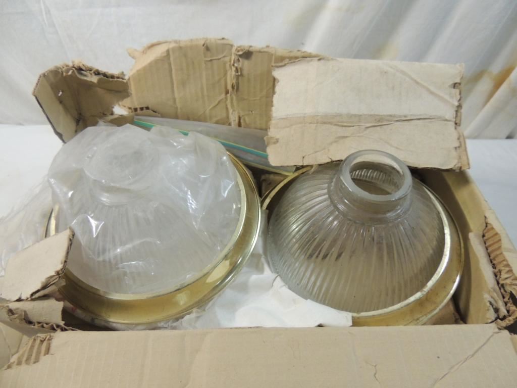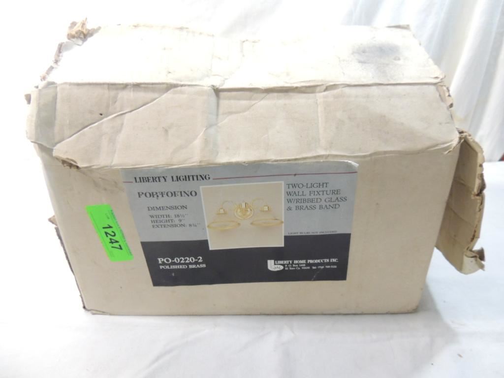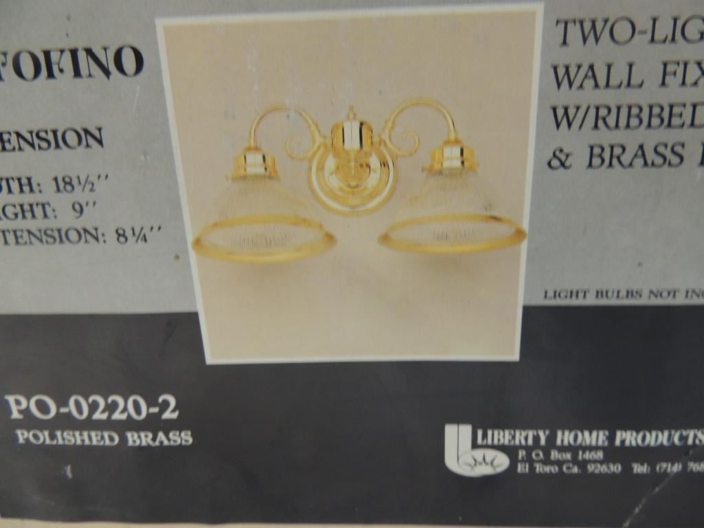 TWO LIGHT WALL FIXTURE W/ RIBBED GLASS & BRASS BAND DIMENSIONS WIDTH 18 1/2", HEIGHT 9", EXTENSION 8 1/4" ORIGINAL BOX. LIBERTY LIGHTING AS SHOWN SEE PHOTO FOR MORE DETAILS.