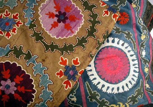 TWO LINED NEEDLEWORK PANELS; One on a beige background, the other with a teal background (worn).