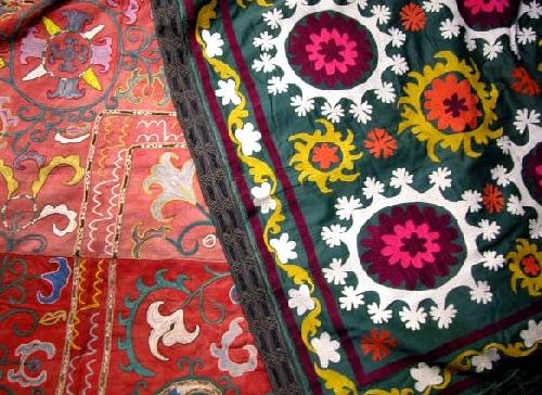 TWO LINED NEEDLEWORK PANELS; One with a red field, the other dark green (worn).