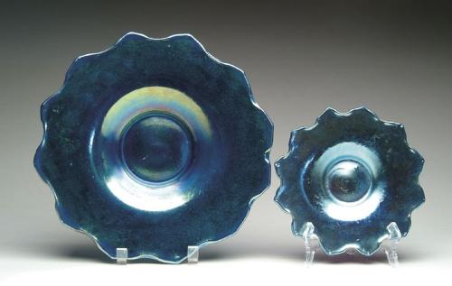 TWO LOETZ OIL SPOT PLATES. Very nice Loetz plates have scalloped rims and rich blue iridescence on the interiors. Backside of plates have nice bright blue iridescent oil spot decoration. The authentic period Loetz plates carry Loetz Austria signatures that were added at a later time. SIZE: 8 in. dia and 12 in. dia. CONDITION: Some minor scratches to interior of plates, otherwise very good to excellent. Collection of Dr. C. and Margaret Chastain 5-61458