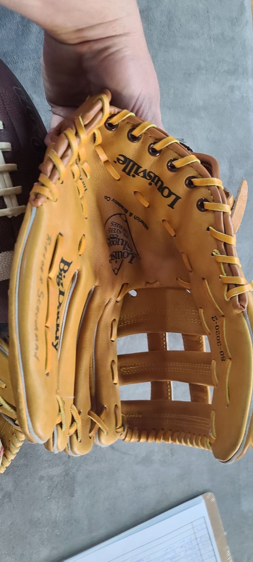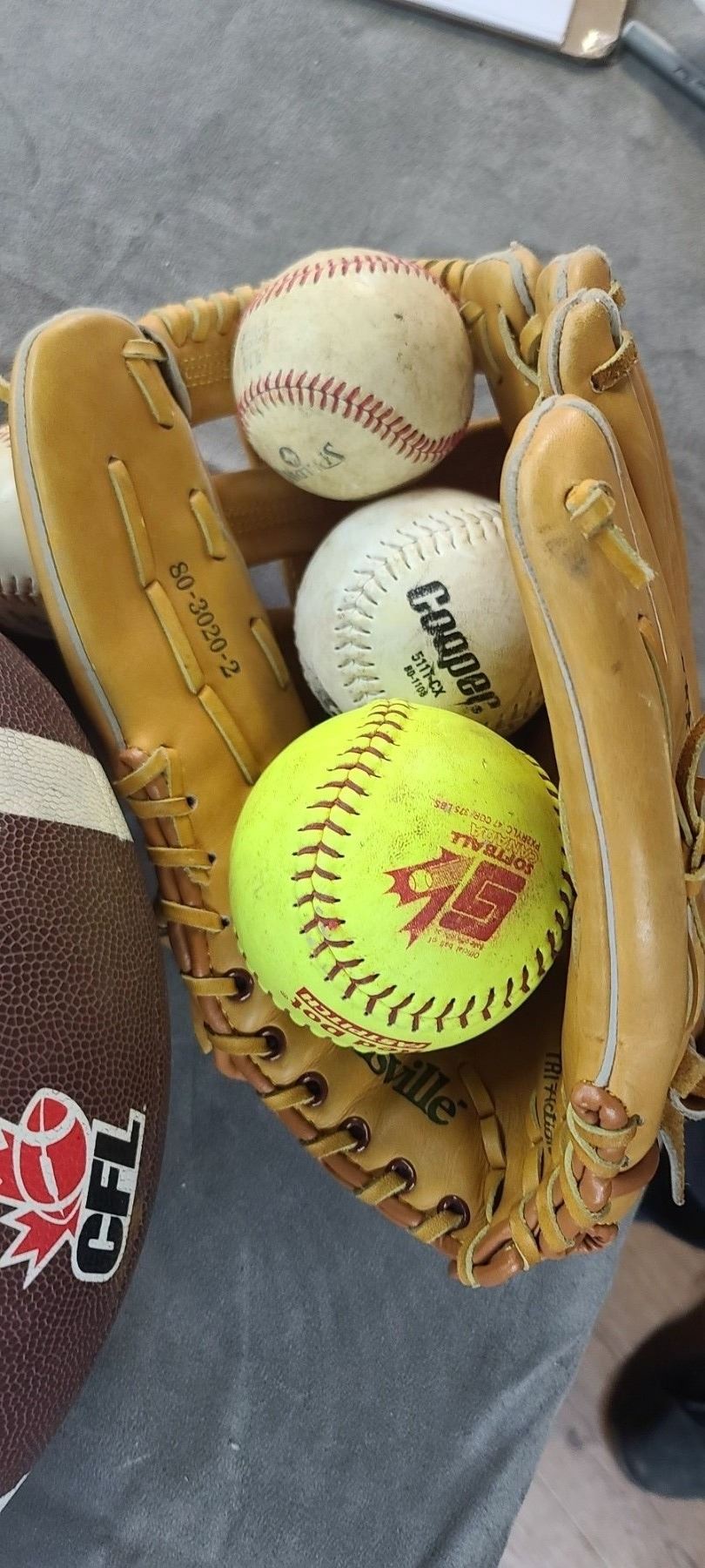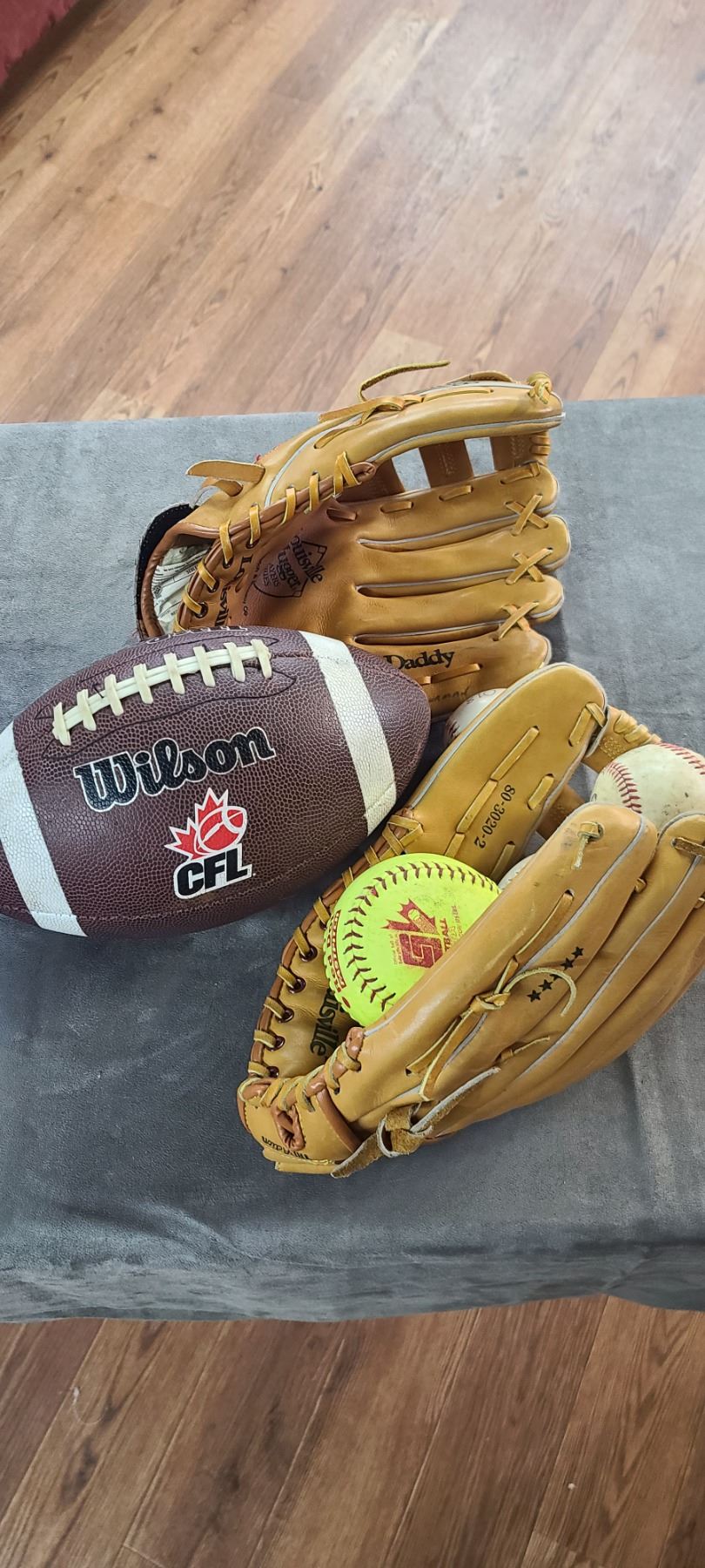 TWO LOISVILLE SLUGGER MITTS AND BALLS, CFL BALL