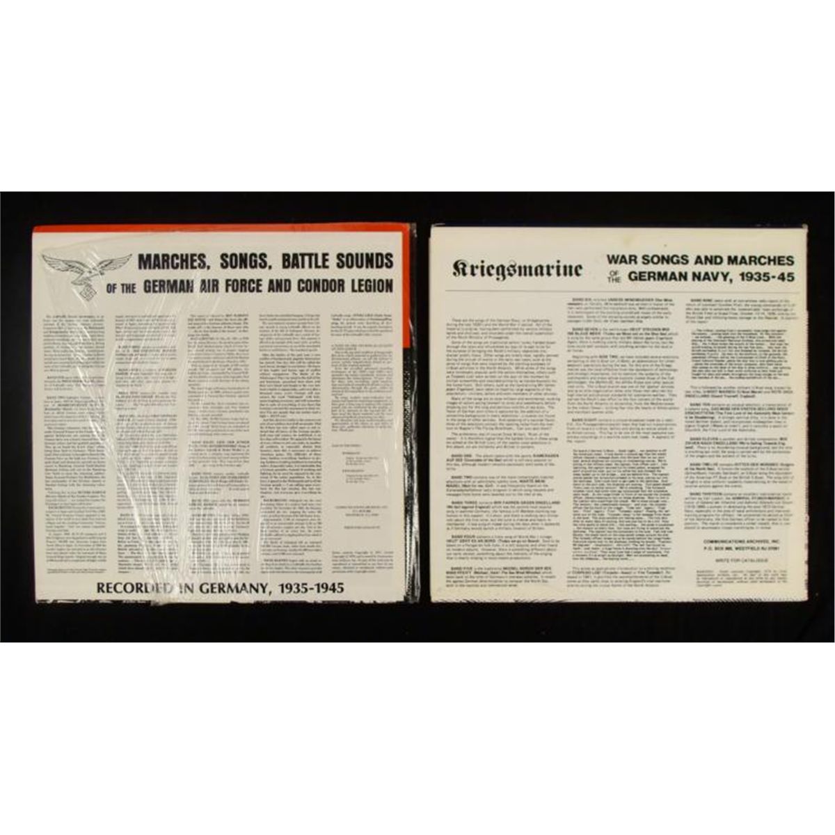 HERE ARE TWO LP'S OF WAR SONGS AND MARCHES OF THE GERMAN NAVY, 1935-45 AND MARCHES, SONGS, BATTLE SOUNDS OF THE GERMAN AIR FORCES AND CONDOR LEGION THAT WAS RECORDED IN GERMANY FROM 1935-45. BOTH OF THEM ARE BY COMMUNICATION ARCHIVES, INC, ARE 33 1/3 RECORDS, APPEARS TO NEVER HAVE BEEN PLAYED, AND ARE IN VERY GOOD CONDITION. * * * *