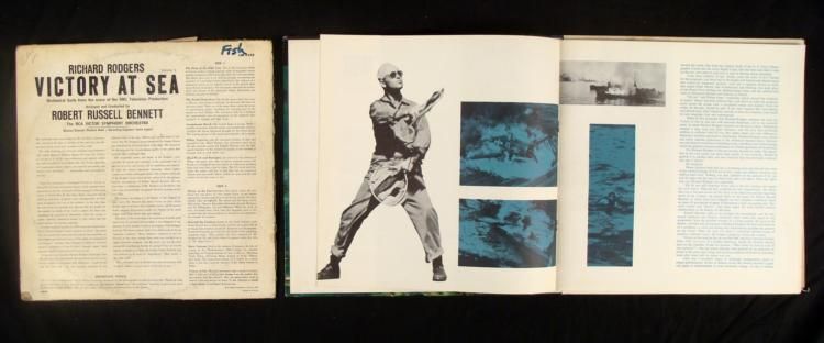 HERE ARE TWO LP'S, "VICTORY AT SEA" VOLUME 1 AND 2. BOTH ARE SUITED FROM THE SCORE COMPOSED BY RICHARD RODGERS, ARRANGED AND CONDUCTED BY ROBERT RUSSELL BENNETT, AND ARE FROM RCA VICTOR READ SEAL RECORDS. VOLUME ONE IS IN POOR CONDITION AND PROBABLY COULD BE CLEANED UP AND VOLUME TWO IS IN GOOD CONDITION. THE RECORDS ARE FROM 1958 AND VOLUME TWO HAS A SMALL BOOKLET INSIDE THE COVER. * * * *
