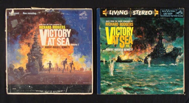 HERE ARE TWO LP'S, "VICTORY AT SEA" VOLUME 1 AND 2. BOTH ARE SUITED FROM THE SCORE COMPOSED BY RICHARD RODGERS, ARRANGED AND CONDUCTED BY ROBERT RUSSELL BENNETT, AND ARE FROM RCA VICTOR READ SEAL RECORDS. VOLUME ONE IS IN POOR CONDITION AND PROBABLY COULD BE CLEANED UP AND VOLUME TWO IS IN GOOD CONDITION. THE RECORDS ARE FROM 1958 AND VOLUME TWO HAS A SMALL BOOKLET INSIDE THE COVER. * * * *
