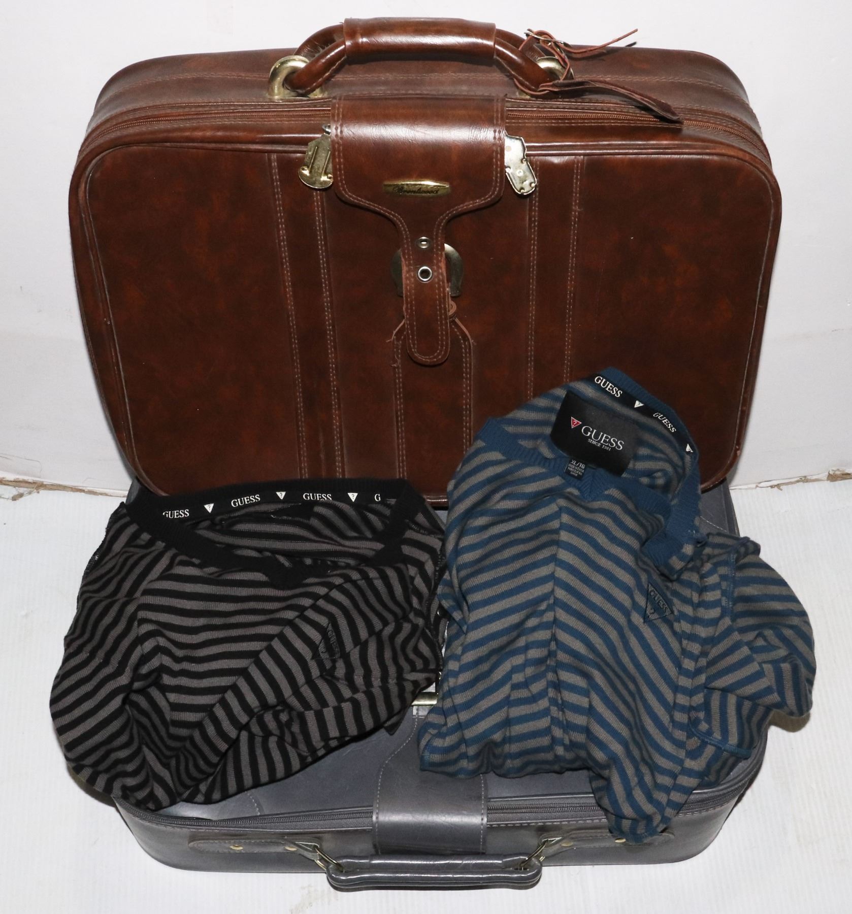 GOOD OVERALL CONDITION. APPROX. 21" X 14" X 5" EACH. SOLD WITH TWO MENS SWEATERS