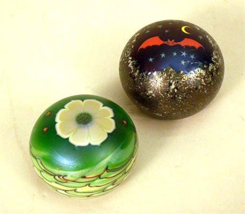 One depicting a bat in a night sky, the other a lily pad in a green pond. 2"h.