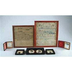 Lot # 367 TWO MAINE SAMPLERS WITH SILHOUETTES AND DAGS OF THE PORTER FAMILY. Lot comprises of: 1) Framed needlework schoolgirl sampler signed “Mary Porter Caroline Brown”. Alpha numeric lines including the location “Blue Hill”. Flower vine border encompassing a circle with “Aged 12 years”. SIZE: 12-1/2” x 10”. CONDITION: Very good. 2) Hollow cut silhouette of Mary Porter. Housed in a black molded wood frame. SIGHT SIZE: 3-1/4” x 2-1/2”. CONDITION: Very good. 3) Schoolgirl sampler signed “Lucia Ann Porter of Sedgwick Bay, Maine Born May 16th AD 1827 Aged 17 Years 3 Months”. Alpha rows with house that has faded. SIZE: 10-1/4” x 9-3/4”. CONDITION: Faded. 4) Hollow cut silhouette of Lucia Ann Porter. Housed in a black molded wood frame. SIZE: 3-1/4” x 2-1/2”. CONDITION: Very good. 5) Double silhouette of man and woman with eglomise glass with oval windows. On back written “Rufus King Porter” and “Sarah Porter”. IMAGE SIZE: 3-1/4” x 6-1/4”. CONDITION: Good. 6) 1/6 plate daguerreotype of Lucia Ann Porter who is one of the girls that did one of the samplers. She holds in her lap the next described daguerreotype of presumably her mother. 7) 1/6 plate daguerreotype, an unidentified but probably Lucia’s mother. CONDITION: Very good. A wonderful opportunity for a documented family sampler, silhouette and photograph lot. 9-99754 (3,500-5,000)