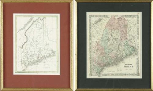 TWO MAPS OF MAINE. Both framed. 1) “Johnson’s Maine by Johnson & Ward.” Colored map shows counties in different colors. Housed in a fine modern gilt wood frame with double mattes. SIGHT SIZE: 16-1/2” x 13-1/2”. 2) “Maine”. Shows Maine with only boundary highlights in color. Housed in a modern gilt frame with red matte. SIGHT SIZE: 10-1/2” x 8”. CONDITION: Very good. 9-27204