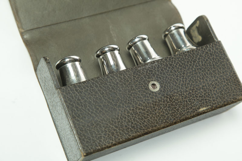 American or European, 19th century. Leather snap cases. Four metal containers, two having glass bottles inside, 3 3/4"h. 6 3/4"w. 2"w. and one with eight screw lidded bottles and six larger ones. 4"h. 7"w. 2"w.
