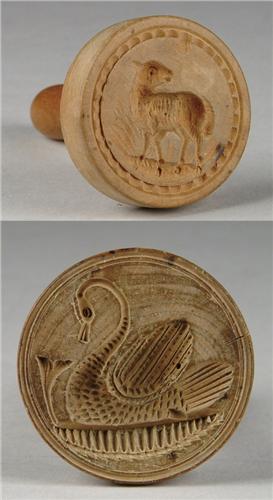 TWO MINIATURE BUTTER STAMPS. 1) One piece circular with swan. SIZE: 2in. dia x 3in. with handle. 2) Two piece circular with sheep. SIZE: 1-3/4in. dia x 3in. with handle. CONDITION: Very good. 9-25388; 25389