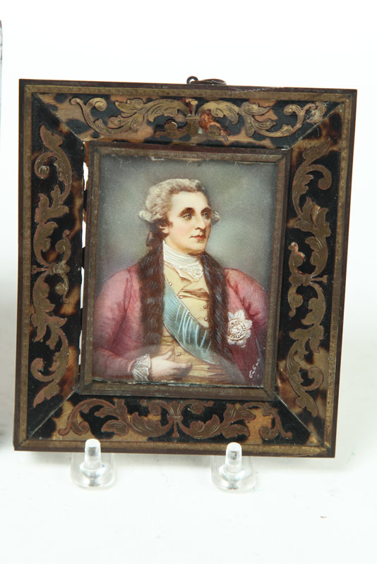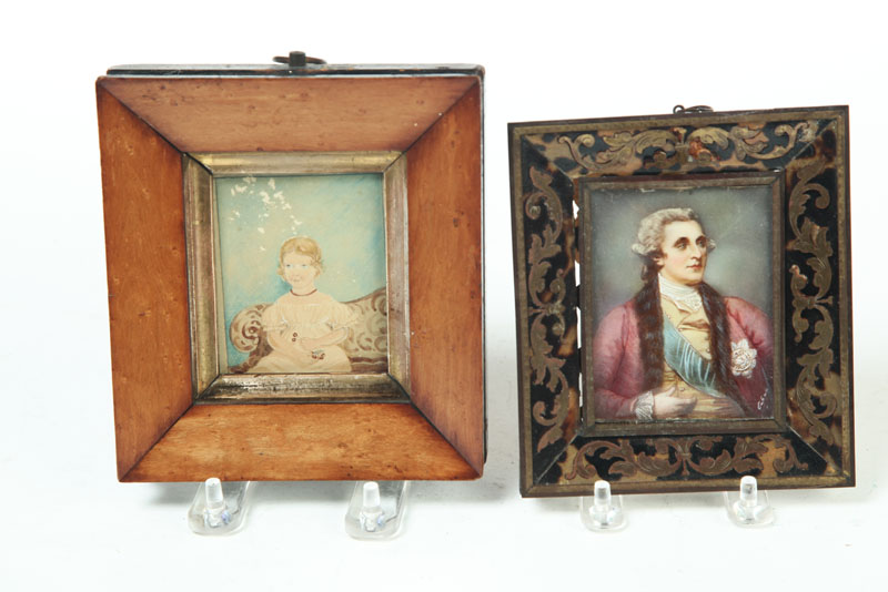 American and European, 19th century. Portrait on ivory of a nobleman. Indistinct signature. In a boule frame, 5"h. 4 1/2"w. And a portrait on paper of a young girl signed "J. Lisle 1839". Flakes. In a frame, 5 3/4"h. 5 1/2"w.
