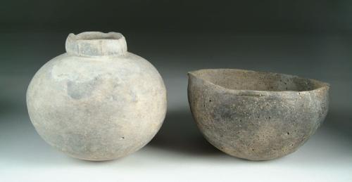 TWO MISSISSIPPIAN TYPE PIECES, WATER BOTTLE AND LARGE BOWL. Mississippian period, Circa 1200-1500AD style. Large four lug handled bowl marked ""Little Tennessee River, Monroe County Tennessee"". SIZE: 9-1/2in. h x 5in. w. CONDITION: Shows minor stress fractures but in good condition. Large water bottle with vertical appliques on neck. SIZE: 8-1/2in. h x 8in. w. CONDITION: Shows rim damage from probable Aboriginal use. Otherwise good. 9-25984-66 The Tennessee Collection of Prehistoric Indian Artifacts from the Allen Graves Estate. SPECIAL NOTE: We do not regularly sell Prehistoric Indian stone artifacts and therefore have very little experience and no expertise in this area. All of the following lots have come from the Collection of the Late Allen Graves of Tennessee. The collection was inherited some years back by his daughter, who now lives in Maine. This collection was consigned to us directly from her. We employed someone to generally identify styles and types, but as stated above, due to our lack of expertise in this field, we can not guarantee the age or origin of the following pieces. We are relying on you, the buyer, to determine to your satisfaction the origin and age of each item in the collection.
