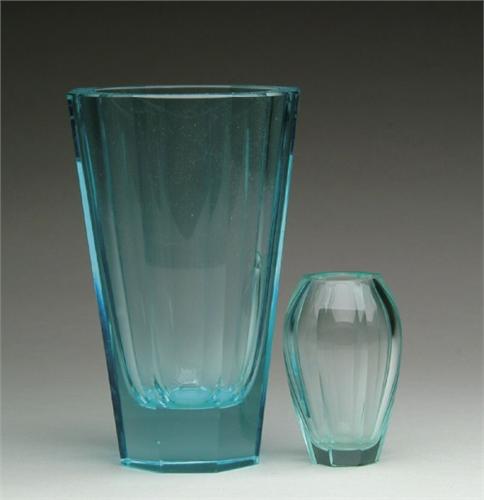 TWO MOSER VASES. Nice Moser vases are done in aquamarine color with the larger vase having eight faceted panels and the smaller vase being curved at the top with eight faceted panels. Both vases are signed on the underside "Moser Karlovy Vary Made in Czechoslavkia". SIZE: 7-3/4 in. t and 4 in. t. CONDITION: Fleabite to corner on larger vase, some roughness to inside lip of small vase. 5-61405