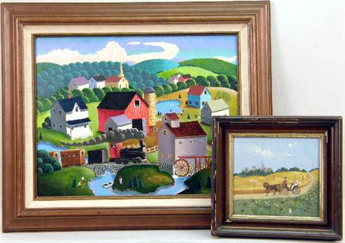 One depicting a horse and carriage inscribed verso Tamara Giva, "GH to the Fair," the other a farm scene, artist-signed l.r., inscribed verso "The Mill Creek Farm by Steve Klein". 16"h x 20"w