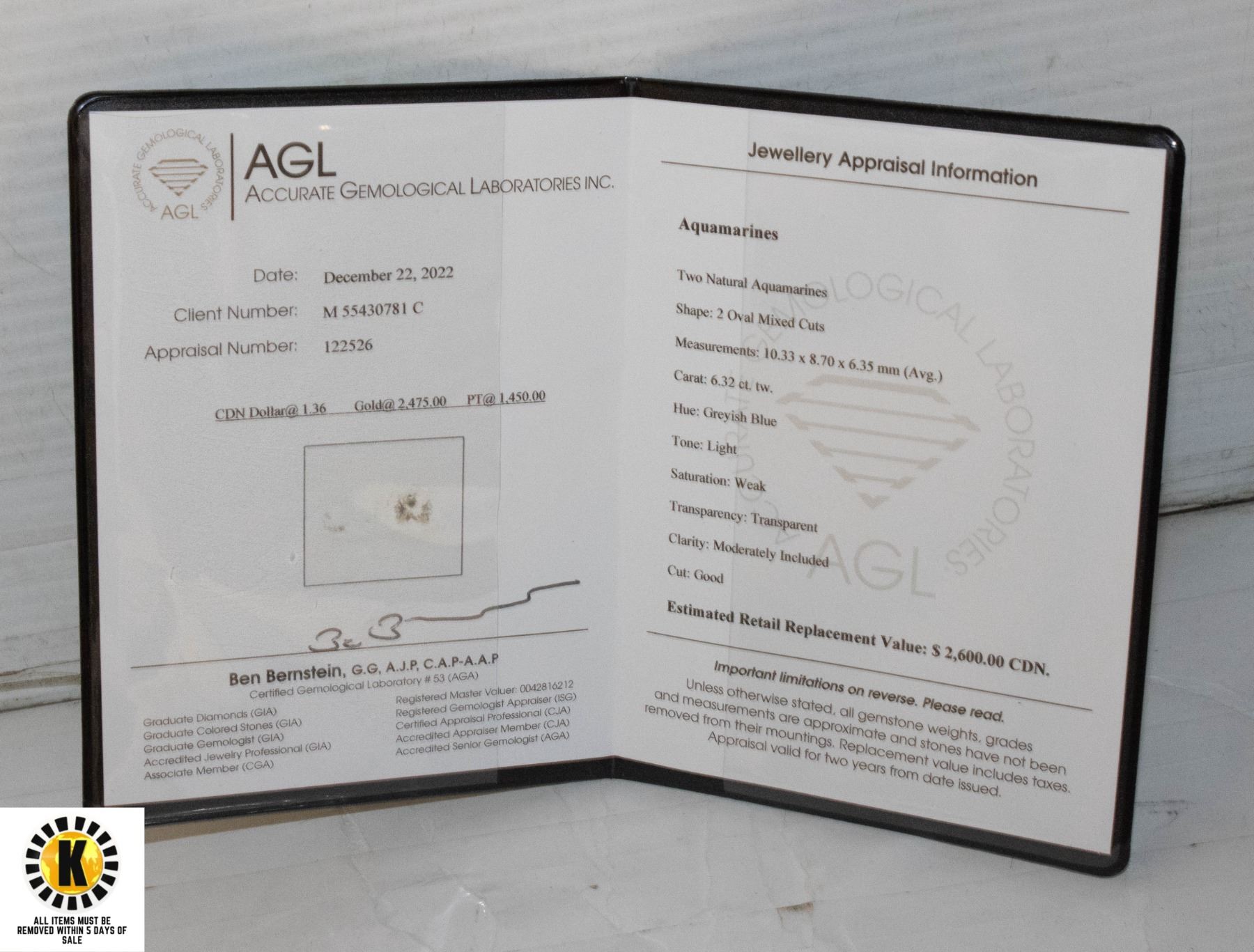 OVAL MIXED CUT AQUAMARINES MEASURING (AVERAGE) 10.33 X 8.70 X 6.35MM, HUE IS GREYISH BLUE, TONE IS LIGHT, SATURATION IS WEAK. THESE TRANSPARENT GEMS ARE MODERATELY INCLUDED, WITH GOOD CUTS. COMES WITH APPRAISAL FROM AGL (122526) AND ARE APPRAISED AT $2,600.00
