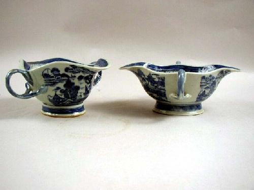 TWO NEARLY IDENTICAL CHINESE EXPORT PORCELAIN GRAVY BOATS, Canton pattern, each with undulating side