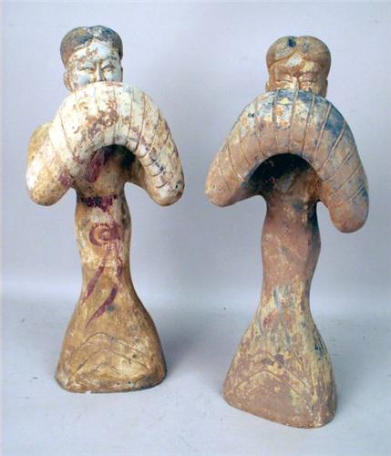 Chinese, probably Shanxi Province, Western Han Dynasty, with arms raised beneath folds of clothing. Some repairs. Approximately 18"h.