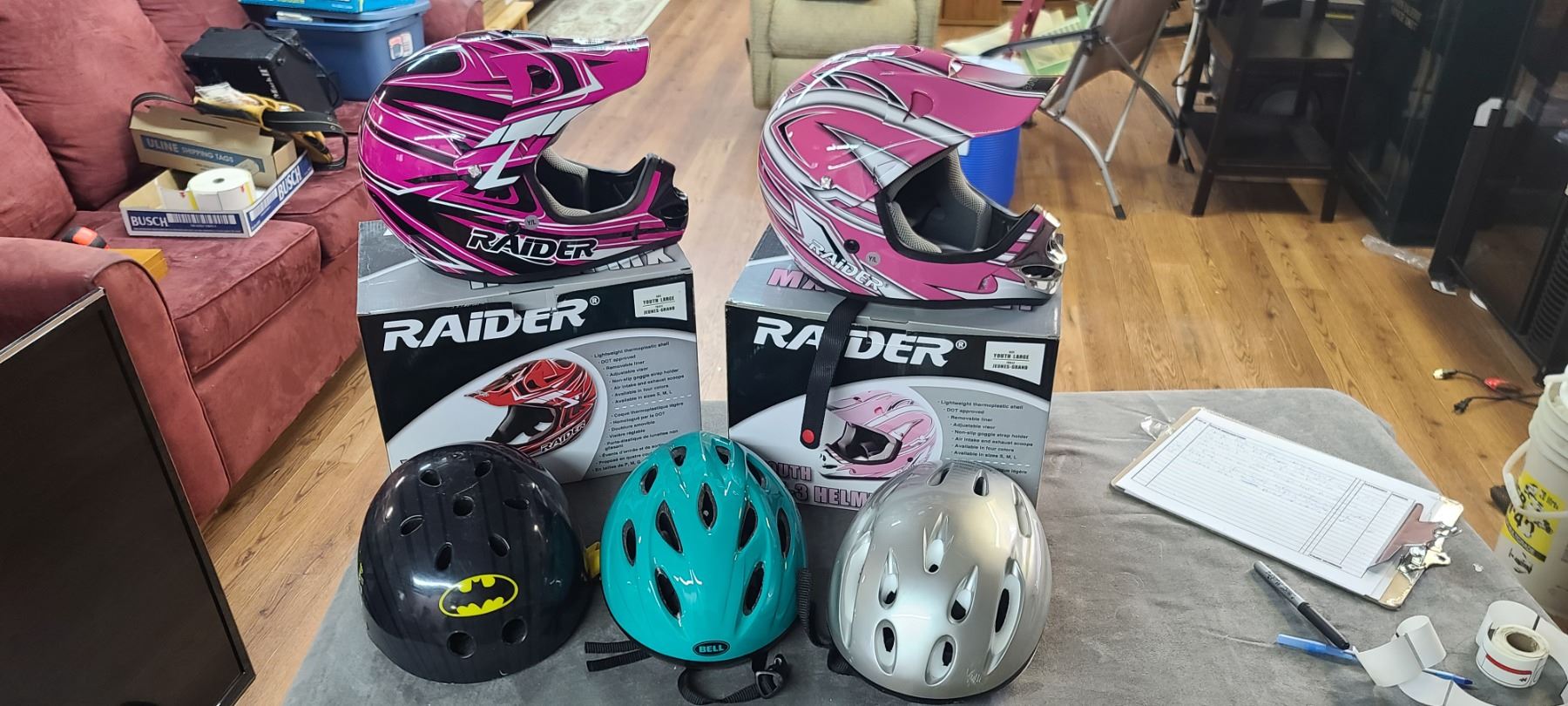 TWO NEW RAIDER YOUTH RUSH MXL AND MX-3 HELMETS AND THREE OTHER HELMETS