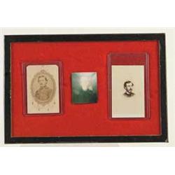 TWO NICE CDVS OF GENERAL NELSON MILES. Two very nice CDVs of the very young and dashing Civil War General Miles in a Riker Mount, accompanied by a trimmed Polaroid photo of a painting of Miles in later life. Miles volunteered as a private at the outbreak of the Civil War and by war’s end was a Major General and Medal of Honor recipient. One CDV has a photo of Miles surrounded by a printed oval border. The photographer and printer are not identified. CONDITION: Very good - corners trimmed slightly. The other CDV has a vignetted 3-1/2” x 2-1/4” photo glued to a card containing the back print "F. L. Lay’s - Photographic Atelier, 31 Winter St. Boston” and a 3-cent Internal Revenue Proprietary stamp. A nice penciled notation reads "Gen. Nelson Miles - succeeded Barlow at Antietam. Wounded: Antietam, Fredericksburg, Chancellorsville, Petersburg. Medal of Honor.” CONDITION: Very good. 4-50108 SO21