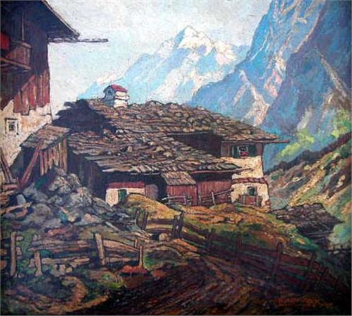 TWO OIL PAINTINGS; One in panel, titled "Farmyard in the Karwendel (Alps)", signed LR F.H. Pfister, dated 1946, the second on canvas, depicting a drawbridge, signed LL E.J. Ligtelyn(?) from 14 1/2"h x 16 1/4"w to 26 1/2"h x 19 1/4"w
