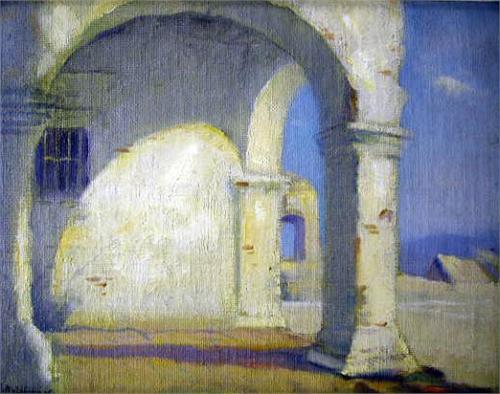 TWO OILS ON BOARD; the first depicting robed men in a mosque; the second a whitewashed edifice. Both signed J. Rolshoven/Tunis (Julius Rolshoven, American, 1858 - 1930).