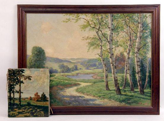 The first a small unframed work signed and dated l.r.c. W. N. Buckingham 1918, the second a framed copse of birch trees in a verdant valley, signed l.r.c. Bernd Steiner (possibly the Austrian artist best known for his poster and lithographic works, 1884-1933). Sight size the first 12"h x 10"w, the second 24"h x 32"w The first with an old repaired patch in u.r.c., an unrepaired 1" tear on the left edge of the canvas, an unrepaired 1/2" tear in the l.r.c. and an unrepaired 1" "L"-shaped tear in the l.l.c., heavy craquelure to surface.