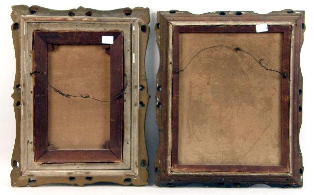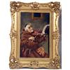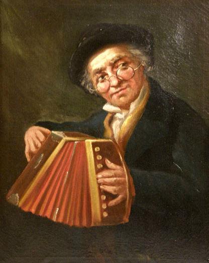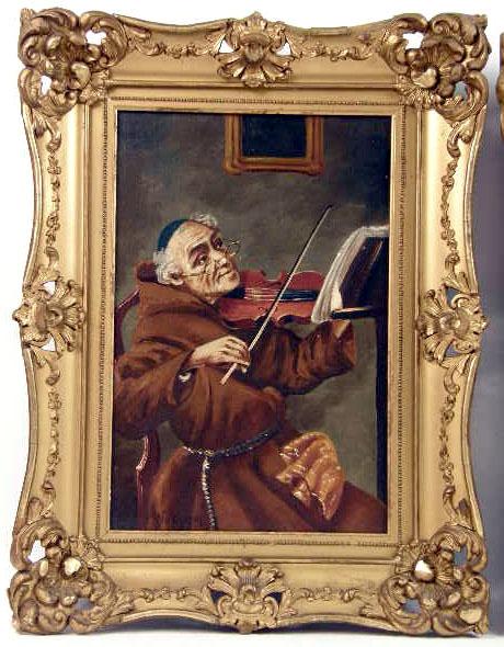 The first depicting a monk performing on a violin, signed l.l.s. Nussani(?), the second a man holding an accordion; not signed. Both in similar giltwood and gesso frames. Sight size the first 17 1/2"h x 11 1/2"w, the second 19"h x 15 1/2"w