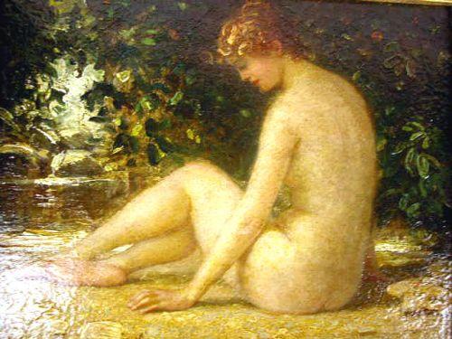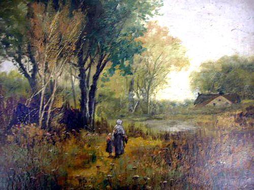 TWO OILS ON CANVAS;One depicting a wooded landscape with figures on a path and a thatched home in the distance, 8 1/2" x 11 1/2", the second a nude seated on the ground next to a pond, 8" x 9 1/2"