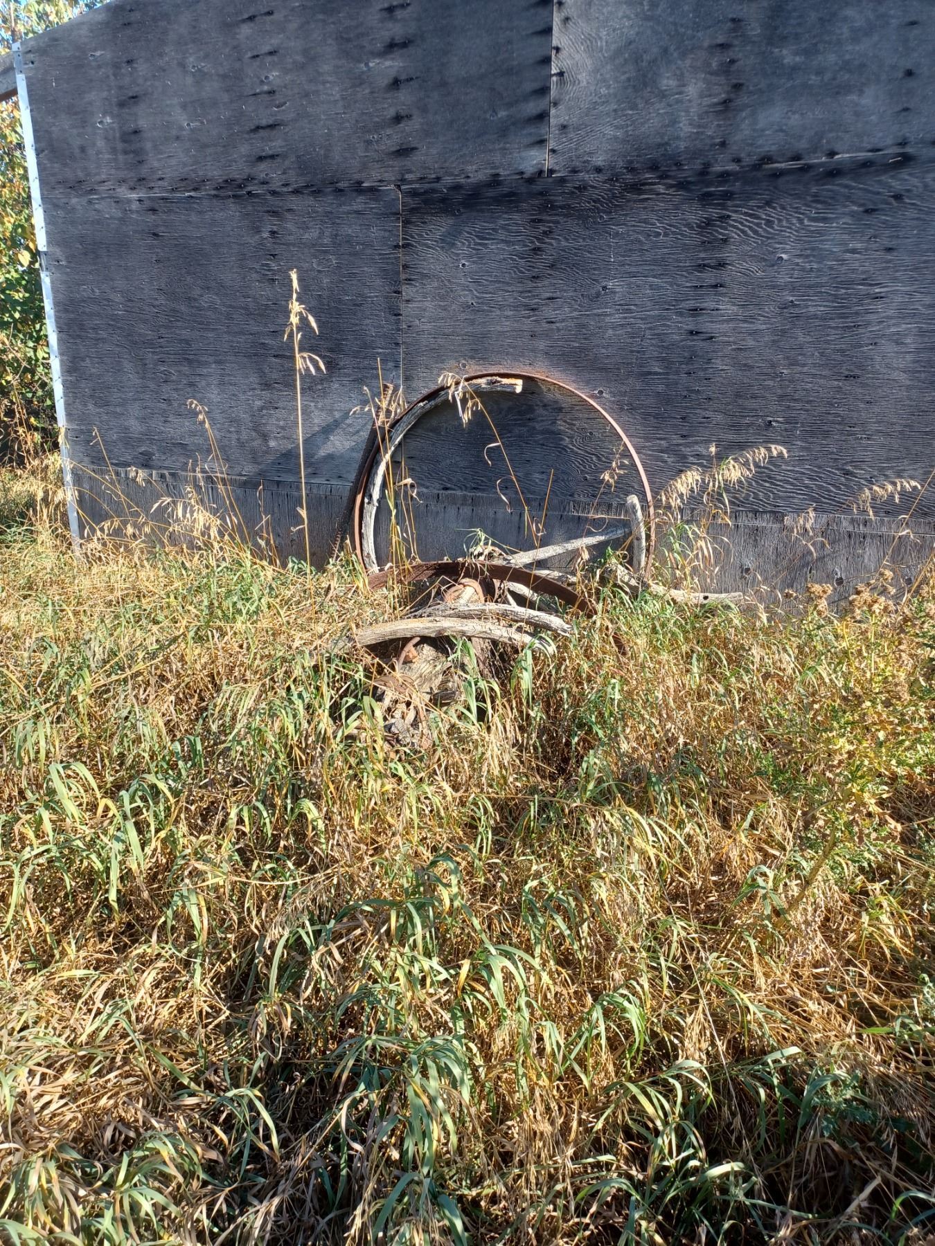 TWO OLD WAGON WHEELS, REBAR CHUNK