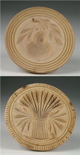 TWO ONE-PIECE CARVED WOOD BUTTER PRINTS. 1) Sheaf of wheat with notched border. SIZE: 4-1/2in. dia x 3-1/4in. with handle. 2) Pear with leaves bordered by circles. SIZE: 4in. dia x 2-3/4in. with handle. CONDITION: Very good. 9-25367; 25372