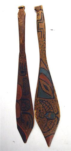 TWO PAINTED AND CARVED PINE PADDLES; North American, some paint of a later date