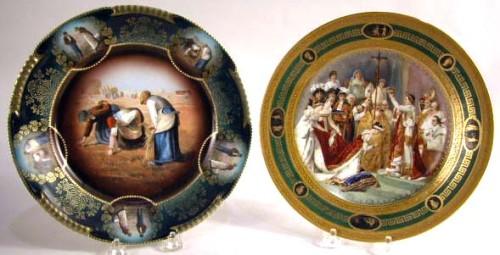 TWO PAINTED AND POLYCHROME DECORATED PORCELAIN PLATES; Continental, one Austrian example depicts the Napoleon I, coronation of Josephine, The second Bavarian examples depicts peasants harvesting a crop 9 1/2" diameter