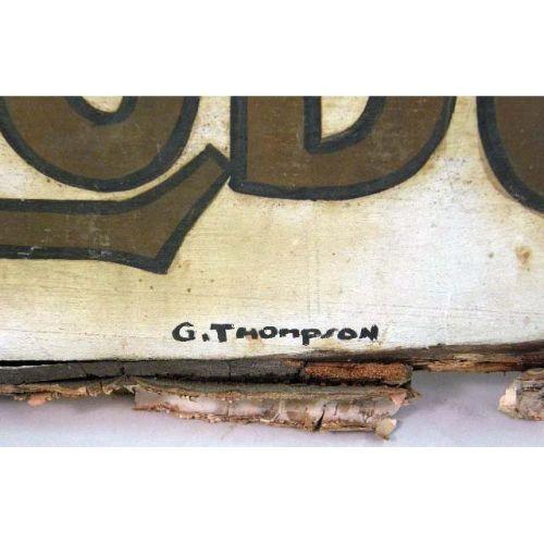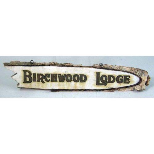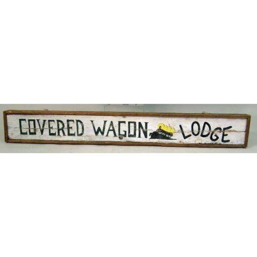 TWO PAINTED SIGNS<BR><BR>the first for the "Covered Wagon Lodge", the second the "Birchwood Lodge", the latter signed "G. Thompson". Covered Wagon 10" w x 73 1/2" l x 1 3/4" d.