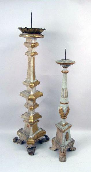 TWO PAINTED WOOD GILT-DECORATED PRICKET STICKS