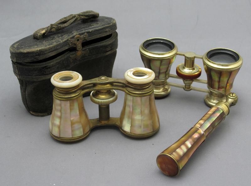-leather cased set of Mother of pearl inlaid opera glasses, together with a second set with Mother of pearl inlaid handle. Losses noted to the second set.