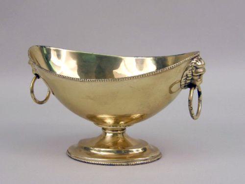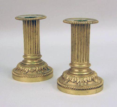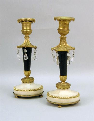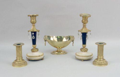 The first of alabaster, black marble, gilt metal and hanging prisms, the second a Neoclassical-style pair in the shapes of truncated Corinthian columns. Together with a lion head-handled gilt-metal oval serving boat. 3 pieces. The alabaster pair 10"h, the columnar forms 4 1/2"h The alabaster sticks with bent elements that need strengthening and tightening.