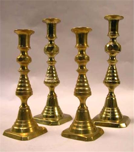 TWO PAIRS OF CAST BRASS "BEE HIVE" CANDLESTICKS; 7 1/2"h and 10"h