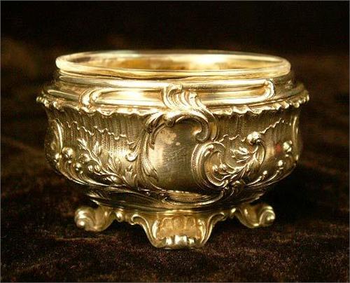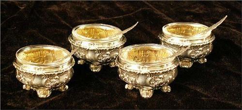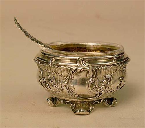 With glass liners and four salt spoons, in original leather fitted case, stamped P. Sabez, 54 Cours Du Cahpenu Rouge Bordeaux, box monogrammed L.L. with crown
